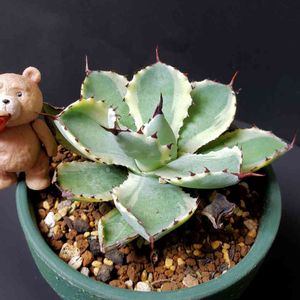 やっちゃった、、、 狩っちゃった、、、 わっちゃっちゃ、、、(←?) 吉祥冠錦さんですʕ•ᴥ•ʔ 王妃雷神以外、アガベには手を出さないようしてたのに(´д`) 綺麗でつい、、、(*´Д`*) 王妃が育ってきて少し自信がつくとコレですよ( ̄∇ ̄) と言うわけで、ポチった翌日、抜き苗で届きました😃 フワフワの綿みたいなのに包まれてたので、箱からそのまま鷲掴み ↓ ザクッ ↓ ギャー!! アガベがどんなものかすっかり忘れてて、早速アガベの洗礼を受けました(´;ω;) 皆様のアガベ植え替えの苦労を実感👿 そして、アガベの抜き苗って根鉢のままなんですね😂 写真でしか見たこと無かったのでちょっと感動。 前がどのくらいのサイズの鉢に植わってたか分かって鉢選びし易かったです😃 アガベ植替えの動画見ながら植え付けました😂 サイズも意外とコンパクトだったのでまだスペース的には大丈夫そう😆 色んなアガベやネペン育てられるようなスペース欲しいなあʕ•ᴥ•ʔ