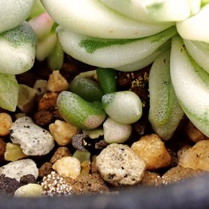 そしてそのスナグルさんの根元に生えてた謎多肉(´-`) アップにして気付きましたが、多分近くの鉢に居るブラックユンナネンシスさん。 影で徒長したのか全然違う雰囲気で気付かなかったよ(・ε・) 葉挿しから増えたのかな?チタノタの鉢より低い位置に居るし、謎•́ω•̀)