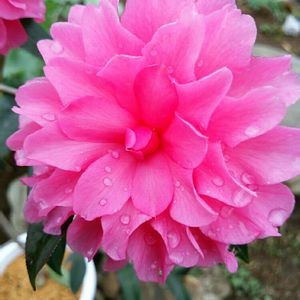 洋種椿 マリーホープテーラー 綺麗なピンク 大輪の花。大人が手を力いっぱい広げたサイズ。 ウエーブのある花びら。 椿と言うより、薔薇に見える。 色を濃くした満開のクイーンエリザベス。