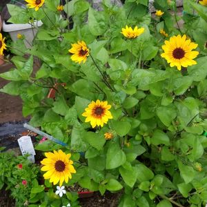 数日前に花壇に植えたミニひまわり☺昨日咲いていました。今朝はちょっと雨に濡れてます🌷