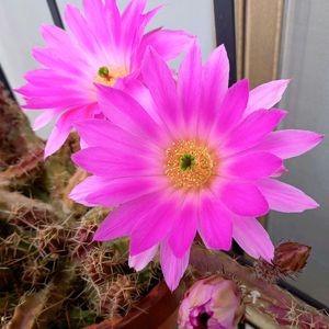 おはようございます👋 エビサボテンに花が咲きました💕 細長いサボテン🌵からビックリする 位に大きなピンクのお花に中心の花弁が 緑色で可愛いです(*^ω^)