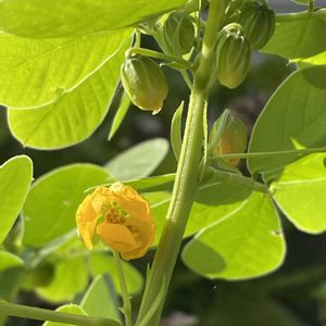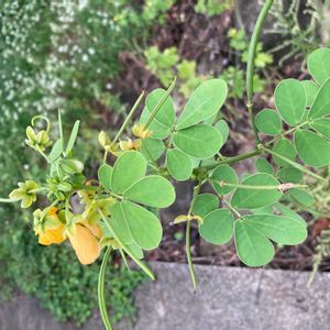 エビスグサ いつの間にか咲いてました\( ´ω` )/ お茶(ハブ茶と呼ばれる物)にする予定だった種(生薬名はケツメイシ)を数粒プランターに撒いたら 1株だけ育ちました。 何杯分のお茶が出来るかなぁ〜🍵