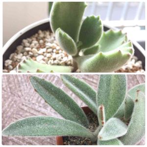 子猫の爪。ニャッパゲ鉢。 来た時程ぷりぷりではなく、もげた葉もあり最初(左上)とフォルムは違うけど、芯の部分は木質化?してきてるし、新芽も♪ うむうむ、かわゆいよ👍