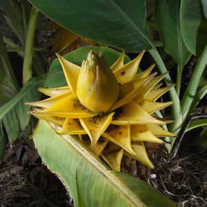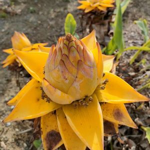 チュウキンレン(地湧金蓮) バショウ科 中国原産 以前GSで目にしていたので、おおこんなところに😍、と思わず写真をとりました。 幅は30センチほど。 苞が一枚ずつ開き、手前のはその付け根に小さな筒状の花が6個ほど見えます。 なんと、順次150日〜300日咲き続けるそう。 バナナと同じく花が咲くとその株は枯れるが脇芽が出る。 チャニーズイエローバナナとも呼ばれるが、実(液果)は長さ3センチほどで美味しくないと。 4/13 新宿御苑温室前