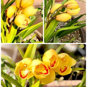 16日投稿のバナナのような蕾🍌(右上) 同じ角度から見たらふっくらと💛💛💛(左上) 前から見たら、歌を歌っているような楽しい表情をしていました🎶💕💕💕 シンビジュームでしょうか?