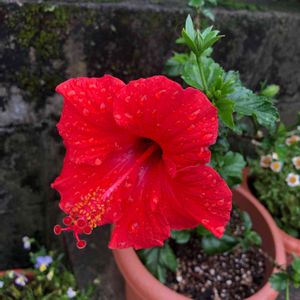 雨の日のハイビスカスの赤が映えて 素晴らしく美しい。 知らないひとが、カメラで撮影していかれたりと、大人気の我が家のハイビスカス🌺 梅雨に入り 憂鬱になりそうだけれど、 花の植え替えたりしながら、楽しくすごしたい。