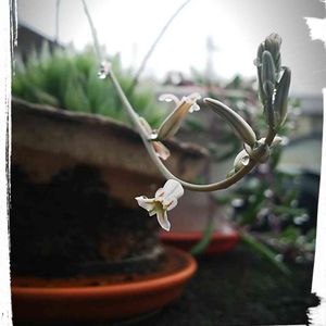 ハオルチア属 トルンカータ氏のお花です。 とっても地味だと伺っておりましたが、そのとおりでしたε٩(๑>▽<)۶з 同時に、紫オブツーサのドドソン氏も花を咲かせたのですが、トルンカータ氏と色も形も全く同じ花でした。 あ、けど、ちっとも残念とかではないですよ! ハオさんを育てだして、初めての花が見られてHAPPYです♡(❊´︶`❊)。۞·: