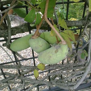 おはようございます😃 ここで、写真を見つけ、私も様子を見に行ってみました。 高い上に葉っぱの陰で、暗くて見難いです。 アケビです。 5、6個なっています。 一番右のものが割れ始めています。 食べ頃です。 隣は空、その横は半分は無くなっています。 鳥にでも突かれたのでしょうか? 子供の頃には小さな川にヤマメ釣りに行くと、川に覆い被さるようにたくさんなっていました。 今にも割れそうなものを選んで、チョコレートの粒が混ざったような真っ白なクリームの塊をしゃぶったものです。😁