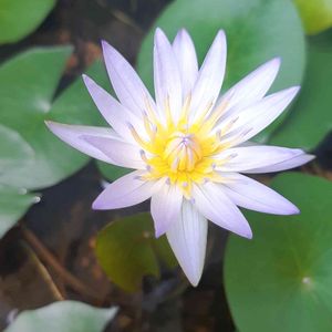 実家のメダカを飼っている睡蓮鉢で白い花が咲いていた。 スイレンの葉のおかげで強力な陽射し遮って貰い、メダカ達は元気に泳いでいた。
