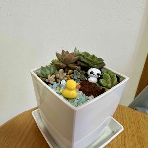 会社の人にお野菜沢山貰ったので、お礼に寄植え作りました。 溶岩石とガラスサンドで水辺のイメージ。アヒルさんと何故かパンダ🐼。