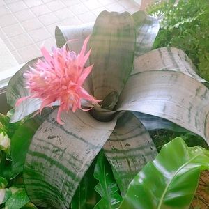 調べてみると、熱帯アメリカ原産の 着生植物🍃エクメア・ファスキアタ 幅広い葉で横縞模様が入っている 別名🍃シマサンゴアナナス🍃