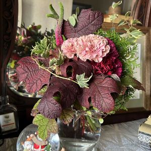 カシワバアジサイのブーケ 庭の紅葉した葉っぱを使って 前回の写真と取り替えたかったのですが、やり方が分からず連投になってしまいました。前のを削除しようと思いましたが、いいね👍してくださった方も見えるので、このまま🙇