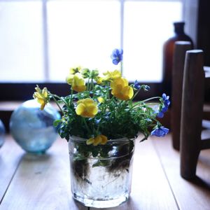 こちらもビオラの水栽培 ガラスボウルに苗を入れ 合間に小さなカップを3つ忍ばせ🥃🥃🥃 その中に 芽出し球根と(pic5️⃣) ユーカリの小枝を入れてます。 そして毎朝 この上に新聞をばーっと広げる旦那。📰 (」゚Д゚)」オイオ-イ!