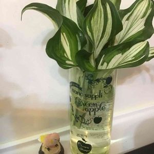 家から 切って 、持って来た ギボウシ🌿 の 葉っぱ です。 使用済みの シャンプーの 容器に 入れました 。 さぁ〜、 朝の 始まり です。。