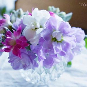 綺麗な色のストックとピンクのスプレーカーネーションを思い切って短く分けて小さくアレンジにしてみました。器はダイソーのキャンドルフォルダーです。 テーブルの上がほんのり華やかになりました ( ⁎ᵕᴗᵕ⁎ )