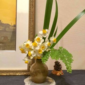 玄関の 台の上、 お花 無くなっちゃったので、朝 適当に 庭から 利用出来るのを 採って来ました 🌸 ニホンスイセンに アジアンタム🌿 と、シャガの葉っぱ 🌱 を 添えました ❣️ 今日も 暖かくなるらしい ☀️