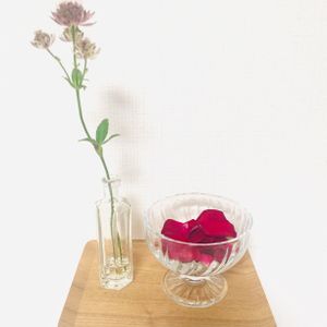 7/8(水) ひときわ美しく、ひときわ長く咲いてくれた赤バラ。 散る時もドラマチックだったけど、散った後もまだ美しい。 花弁が、肉厚で、萎れていないんです😳 器に入れて眺めることにしました♪ 一緒に飾っているのは、8日目のアストランティア。 色はだいぶ褪せてきたけど、まだ元気。 茎の曲がりが芸術的だな〜と思うのです😚