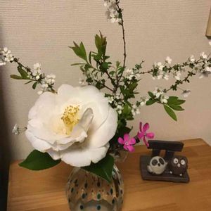 我が家の 小さい 椿🌺さん で〰️す ‼️ 最近、咲き始め いっぱい 咲くんですよ❣️ 咲き終わった 福寿草 🌿を 合わせました!!