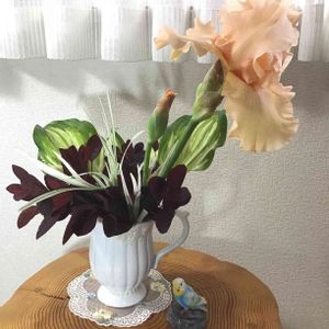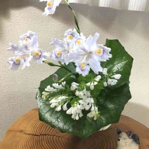 おはよう😊ございま〜す ❗️ 朝、庭の草花で 生けました🌸 ☆ ジャーマン アイリス ☆ スモークツリー の 赤紫の 新葉 ☆ ギボウシ🌿 ☆ 斑入りヤブラン シルバードラゴン です。 昨日は、気温上がり、暑かったですが、今日は 朝から どんよりデス ‼︎ ☁️☁️☁️