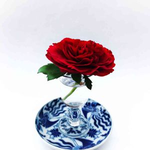 連続でごめんなさい。 幹から直接ステムがでて花を咲かせてしまった、レッドレオナルドダヴィンチを藍の小皿と合わせてみました♪ 写真じゃなくてまるで絵の様な写り方になってしまってます。物凄いレッドですね。