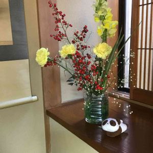 お正月🎍の お花 を 分解した 残りの 小集団🌼 こちらは、黄色い 花🌼 だけ、 集めました。 ただ 寂しいので、庭の 南天を 付け加えました。 器は、ペットボトルを 切って、 利用しています❗️ 何故か、、パンダ🐼さん添え デ〰️ス 💕 ☆ カーネーション ☆ 金魚草 ☆ 南天の 実 ☆ ニューサイラン ☆ カスミソウ ( 少量 ) です。