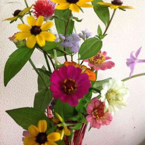 本日 、1000回目の 投稿になって、 よく 続いたもんだと 思います。。 実は、GSは 次男の お嫁さんが 知っていて、このアプリを 入れてくれたのは、ひょんな事で 急に 帰省した 長男 でした。 花🌸が 好きだった私ですが、花よりも 庭に来る虫や 野鳥に 興味が 移って、初めて まざまざ見た 蝉の孵化の pic が 手元に あったので、せっかくだったので、それを 載せてみたい‼️と、それで スタートしたのでした。😅 この 1 年間、皆さまの いいね!を いただいて 結構 、投稿して 楽しんで 参りました🌸🙇♀️ たくさん、花や 庭に来る生き物の 投稿を して来ました。 これからも、少し マイペースに なると 思いますが、宜しく お願い🤲致します❣️(╹◡╹)♡ 今日のは、1度 投稿したアレンジの 細部を 大きく写したpic です いろんな花🌸が 入っていて、 ☆ 百日草 ☆ ルドベキア タカオ ☆サンジャクバーベナ ☆ ツルバキア ☆ ユーパトリウム ☆ センチニコウ ( 赤 ) です。 いつも、お世話になり ありがとう😊ございま〰️す💕🙇♀️