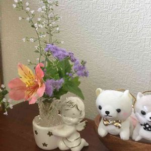 今朝は、アルストメリア を 1 輪 摘んでみた 関係で、今 庭に 咲いてる花🌸と、 合わせてみました 花🌸が、メイン なので、マスコット が、切れてしまいました..💦 ☆ アルストメリア ☆ ユーパトリウム ☆ カラミント です。