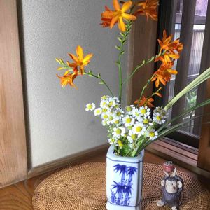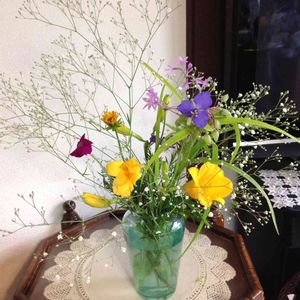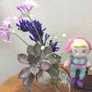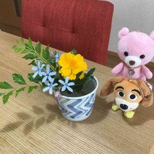 こんにちは😊〰️‼️ 投稿 出来ないか?って、思っていますが、こんなこと やっています.... 😅💦 今、お嫁さんは、 お昼寝中.... お花🌸は、あまり 咲いてないのですが、 庭に出て 見回して、、唯一 咲いてる中から、なんとか 1 作品 出来ましたぁ〜💕 ☆ ブルースター ☆ キバナコスモス ☆ シマトネリコ ( 添えの 葉 ) です。 マスコットは、私が あげたものです❣️😁