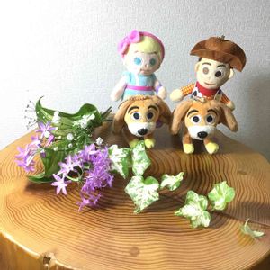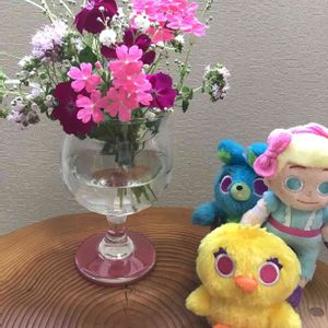 ピンクの 美女桜 🌸が 可愛く💕って、庭で 摘んで また、作ってしまいました😅💦 マスコットは、私は あまり知らないのですが、たぶん 何かに 出て来る キャラクター なのか な。 ☆ 美女桜 ( バーベナ ) ☆ オレガノ の 花 ☆フランネルソウ ☆ かすみ草 ( 少量 ) ☆ベア グラス ( 斑入り カンスゲ ) です。