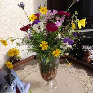 チョコレートパフェ 風 .... 😅 ☆ ダールベルグデージー ☆ フランネルソウ ☆ ビオラ ☆ レースラベンダー ☆ 月見草 ☆ オキザリス ☆ かすみ草 ( 少量 ) です。 いっぱい 詰め込みました、過去作 です。🙇♀️