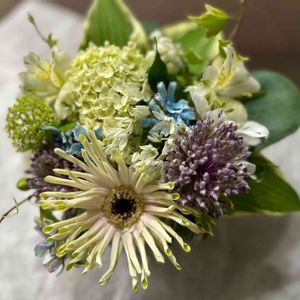 こんばんは♪ 今日は教会⛪️礼拝に出席 母の納骨〜母のお別れ会を無事終える事ができました。 教会員の方から母の写真の側に置く花を作って欲しいと頼まれ 庭のギボウシ、ヘデラ ようやく開花始めた紫陽花 ブルースターに お花屋さんのガーベラ アストロメリア アリウムを足して小さなアレンジを作って届けました。