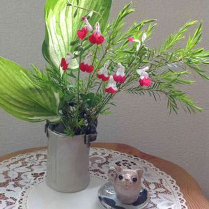 チェリー🍒セージ ホットリップ が 可愛い💕く 咲いてくれているので、思わず 少し、切りました。 ☆ チェリーセージ ホットリップス ☆ 斑入りギボウシ の 葉 ☆ ティー ツリー の 枝 です。 ティー ツリー の 木も、チェリーセージ ホットリップス も、ご縁 あって、始まりは ご近所さんから 頂きましたぁ〜❣️ 7月 半ばから ちょっと お休みする予定なので、ちょっと 今しばらく お付き合い下さいませ 🙇♀️