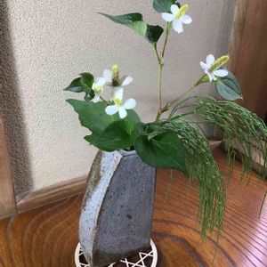 おはよう😊 ございま〰️す ‼️ 暑すぎて、大丈夫ですか?😳💦 朝、涼しげに 生けました🌸 ドクダミが はびこって、草取りは、イタチごっこ‼︎‼︎😂 でも、和風に ちょっと 生けるには、良さそうです。 ドクダミと、ヤブガラシが 生育旺盛で、これらの生命力に 脱帽 です。😅 暑くて、こっちは 生命力 落ちそう、、、ただ ただ、頑張らなくっちゃね‼️✨✨✨🤣 ☆ ドクダミ ☆ ヒメヒオウギ です。