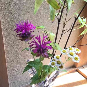 おはよう😊ございます‼️ この間、投稿したのですが、小さく 写ったので、その部分だけの 良く分かるpic が あったので、 再投稿😁 庭の 鉢植えの 黒竹、古くなった枝を 切りました。 すぐ 捨てるのも 可哀想💦 で、 生けてみました。 たまたま 咲き始めたので、桃色の モナルダ 🌸 と、白い小花の フィーバー フュー が、 入りました。 家に 咲いてる花🌸 から ピックアップされるので、思ってもいない花が 合わされちゃいます😅💦 昨日は、思いがけず 寒い😨天気に なっちゃったけど、今日は どんな天気か?.... そんなに 良くない天気😳 なんですよね、、晴れないよね! 😁