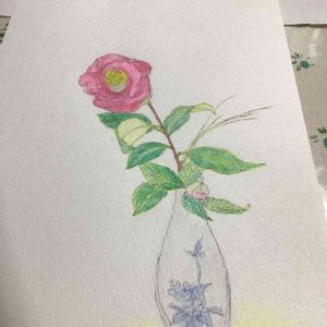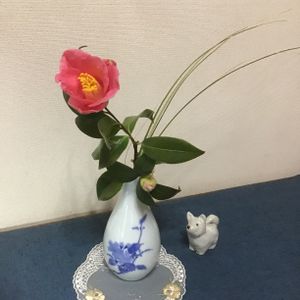 朝、庭の端っこで 椿🌺の花 が、 咲いていて、気付いていませんでした ..... あまりに 端っこで ポツンだったので、 連れて来て、 玄関に 生けてみました。。