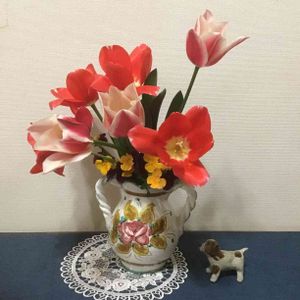 雨☔️上がりの チューリップ🌷 、これは 陽当たり イマイチの所で ヒョロリと 華奢に伸びてる 2年目の球根の チューリップさん達🌷🌷🌷 ひょろ ひょろするから、もう 切って来て,切花に する事に しました。。。 取り敢えず バ〜ンと 花器に 放り込んでおいて、ビオラの花柄摘みして 家の中に 入って来ました〜❗️ お腹空いた、朝ご飯🍚 頂こう〜🥢