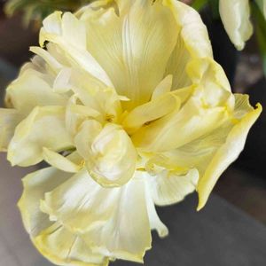 緑がかった純白のチューリップ⸜🌷︎⸝ 咲き進むにつれ クリーム色に… ん❓ 結構黄色に🟡 毎日毎日の変化に 心が癒されてます🌼*・