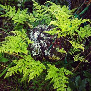 岩に這うツルをぐるぐる巻きにまん丸にして、シダを植え込んで松の木に吊るしてあります。毎年楽しませてくれてありがとね。
