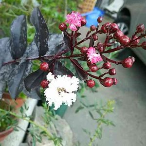 サルスベリ ブラックパール ホワイトなんだけど赤花も混じってますね(-ω- ?) 葉っぱが白くなってるのは病気ですかね?うどんこ病みたいな感じ😱