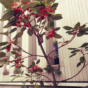 「ヤマボウシ」の紅葉✨ 細かい葉っぱが赤くなるのもきれいですね😄 奥は常緑の「ロドレイア」です💓
