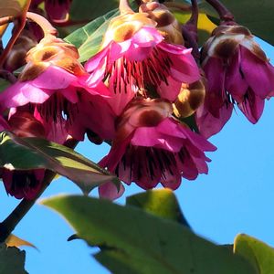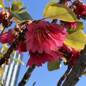 ロドレイア 別名)シャクナゲモドキ 素敵な花が咲いてました‼️ 澄んた青空にコラボですね❗ 🙏ごめんなさい 勝手に道端pic してしまいました