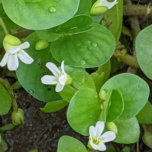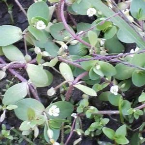 水生植物 一日花 花は直径8mmほど 葉は肉厚でうちわ形状🎶 (水田) 浮畦菜(うきあぜな) オオバコ科