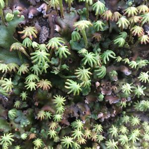 隣のおうちの石垣にあるのを発見🧐 これはいったい何⁉️ 小さいヤシの木みたいで可愛い🌴 ※はるさんにゼニゴケと教えていただきました😊