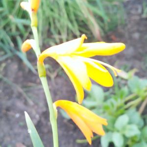 おはようございます😃 クロコスミアの花が咲きました。 昔からあるこの花は、丈夫で、手入れをしなくても、毎年良く咲きます。