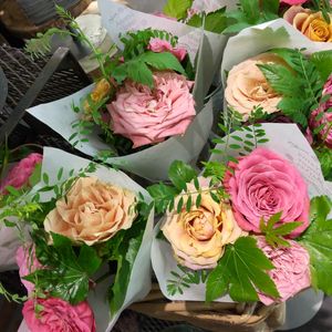 昨日、無事にママとベビーが退院してきました🎶 まだ名無し😅 いい名前を付けてあげてよ新米パパ٩(ˊᗜˋ*)و ①知り合いの薔薇生産者さんに頼んで、お帰り、お疲れ様の花束💐を作ってもらって、お嫁チャンにプレゼント💐 ②「新米バァバおめでとう🎊」と私にと生産者さんから花束💐いただいちゃいました〜💕 ③昨日の強風に負けなかったヒーリング🌹可愛い❤ ④モーリスユトリロ🌹黄色多めだけれど綺麗💕 ⑤ウエディングベルズ🌹綺麗に咲いてくれました〜💕 これからは強風吹く日が多くなるだろうから💦薔薇🌹も傷んじゃう💦 でも頑張れ〜🎶