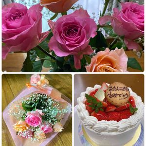 今年も薔薇の花束頂きました💐 : ケーキは近所のパティシエさんに注文 娘からです🎂 ありがとうございます😍