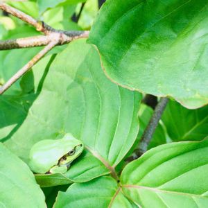 居た〜ッ(((o(*゚▽゚*)o))) ヤマボウシの葉陰に雨蛙🐸カメラを向けたらンッて見上げました😻