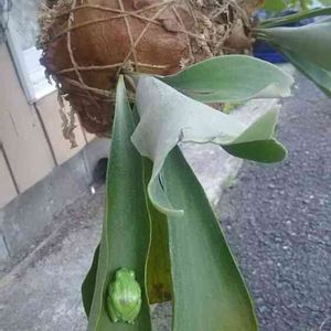 山奥自宅のクンシランの葉にアマガエルの赤ちゃん 一昨日はモリアオガエルの赤ちゃんだったから、今朝も同じかとのぞいたら今日はあなただったのね。 仲良く一緒にクンシランの中にいるんだね。