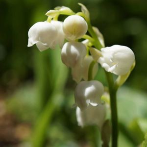 今日のお花 スズラン キジカクシ科スズラン属 多年草 別名は君影草(きみかげそう)谷間の姫百合(たにまのひめゆり) 高原などに群落を作って生育している。 草丈は15〜20cm、葉はふつう2枚が抱き合って伸び、葉の間から花茎を伸ばして白い釣鐘形の花を咲かせる。 イギリスなどでは、5月1日にスズランを贈ると幸福が来るという風習がある。 花言葉は「清浄」「幸福」 花期4〜5月 ドイツスズランはヨーロッパ原産で、日本原産のスズランよりも草姿および花ともに大型で丈夫。 葉と花が同じ高さで開花し、香りが強い。 日本原産のスズランは本州中部以北に分布。 葉のかげにかくれるようにひっそりと咲き、高温多湿に弱く、やや育てにくい。 これらはドイツスズランですね。