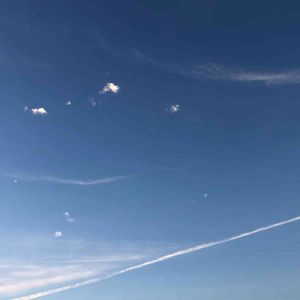 17時頃の空② 飛行機が通過した後✈️ 誰か空歩いた? 足跡の様な🐾🐾🐾 こちらも不思議な雲でした。 空を通過する飛行機が、〇〇発 ◎◎行き と調べられるアプリがあるそうで、公園で出会ったパパさんが「上海行きだよ」と教えてくださいました。